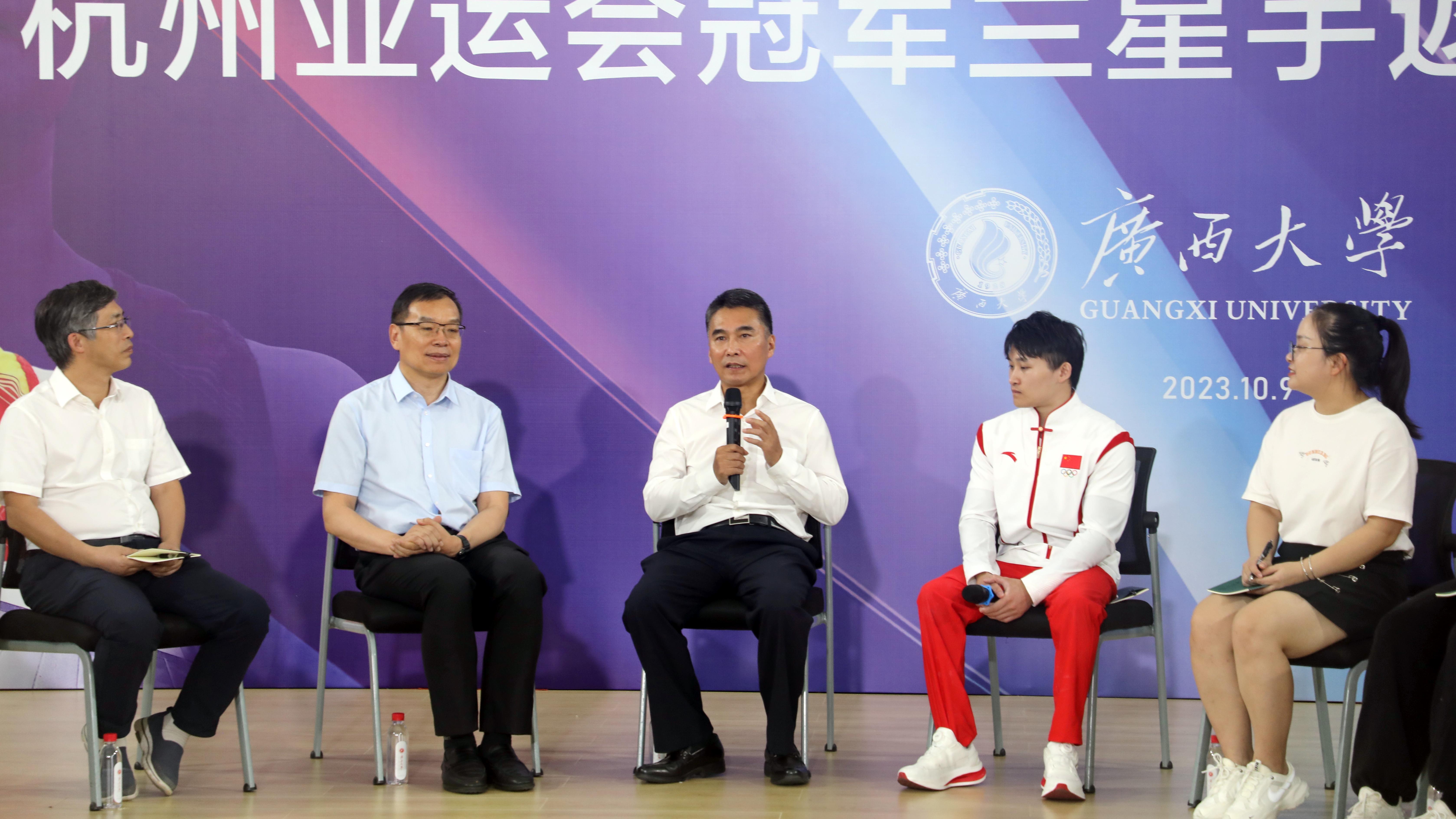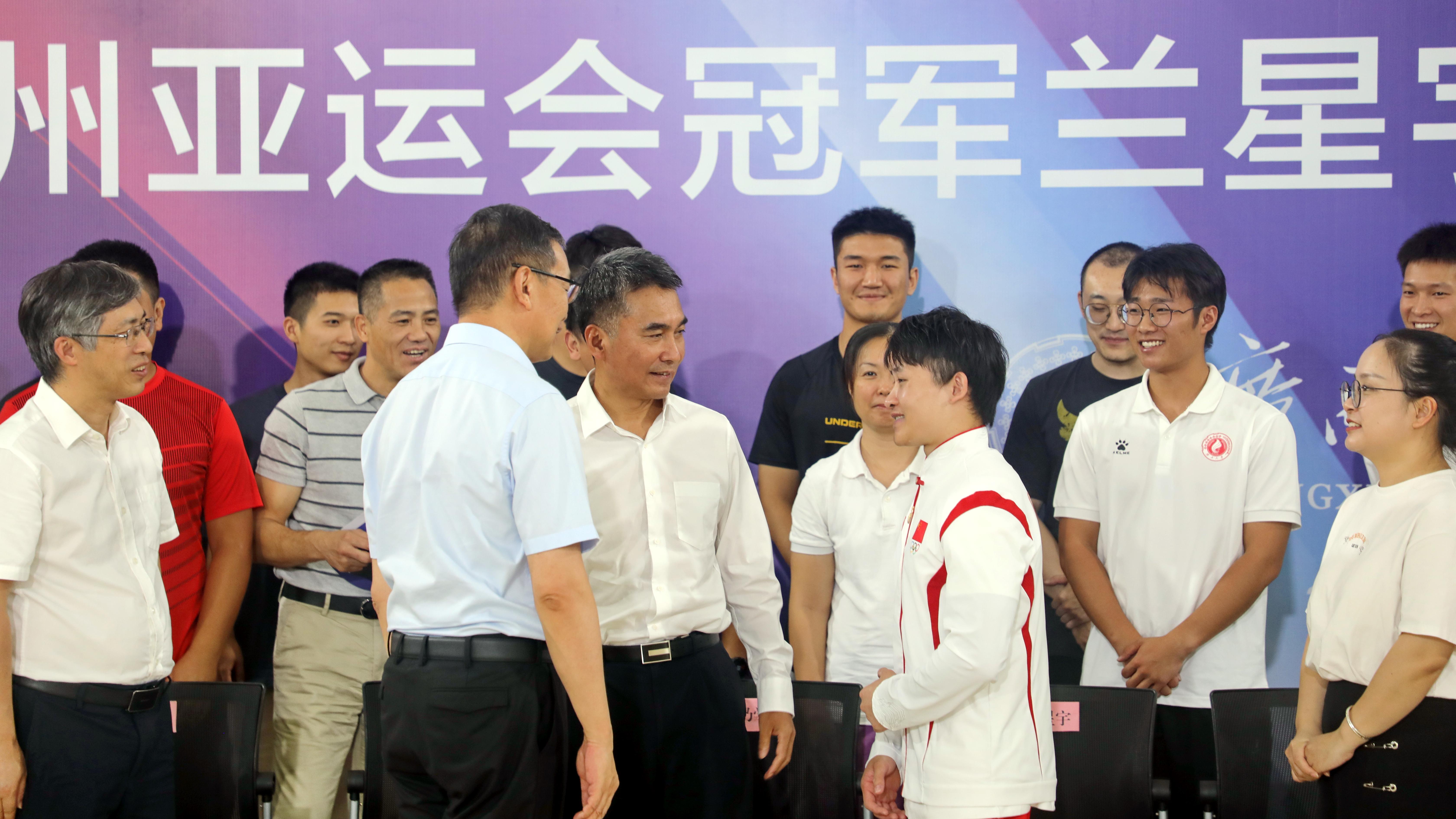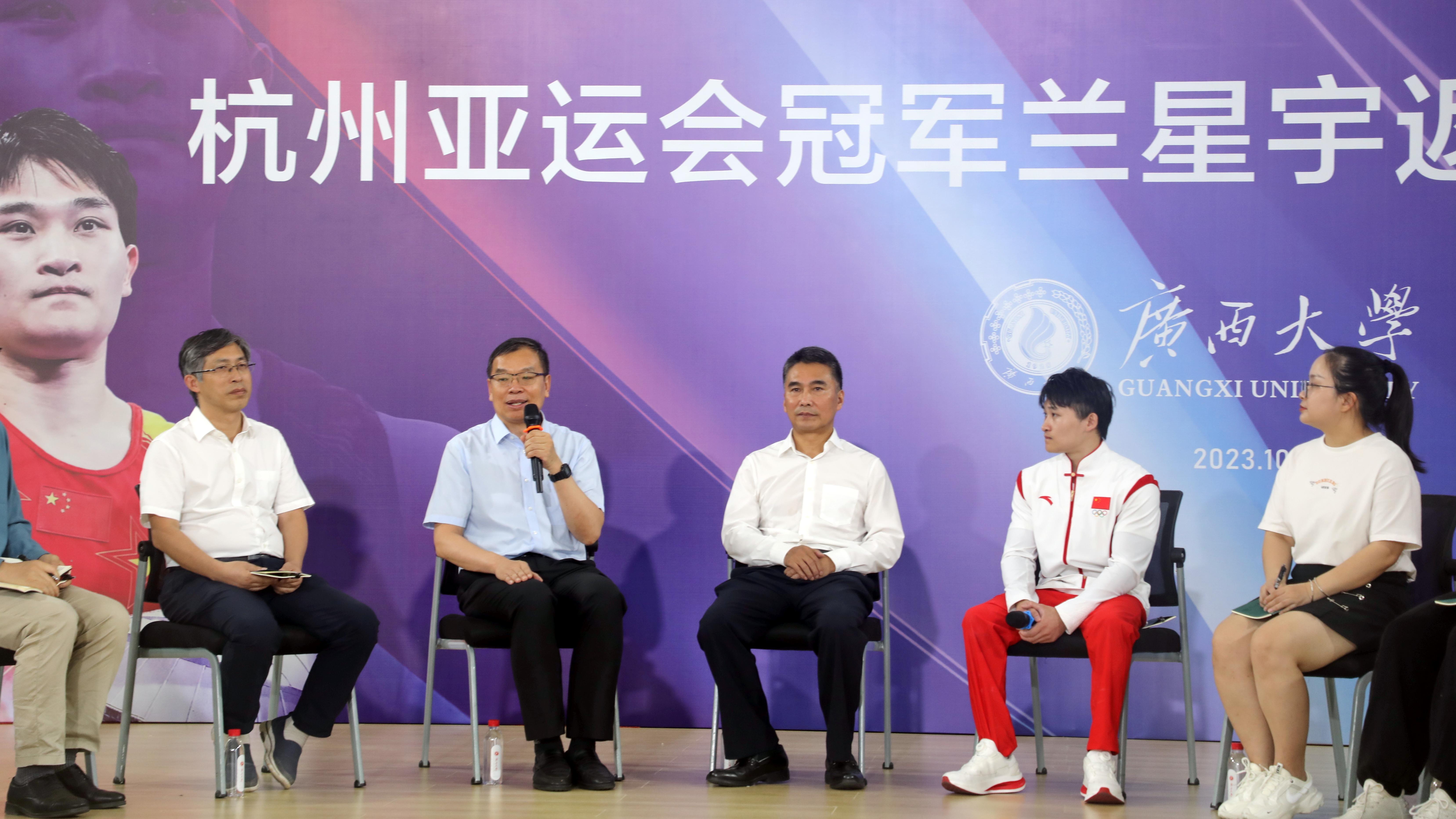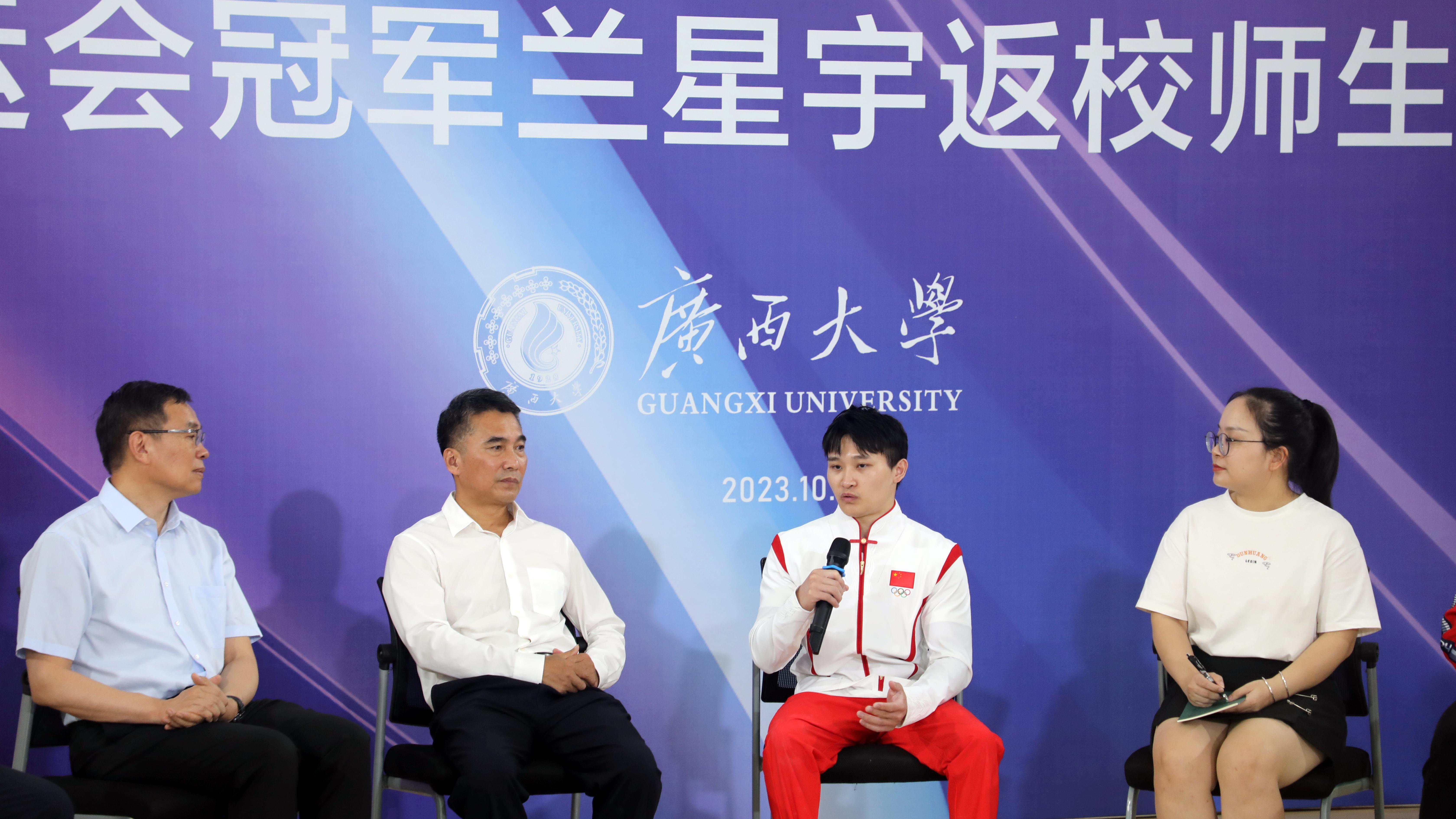 王乃学指出,兰星宇同学在杭州亚运会赛场上与队友团结协作、顽强拼搏,发挥出较高的竞技水平,有力诠释了更高更快更强的体育精神,取得了2金1铜的优异成绩,给学校建校95周年献上了一份“大礼”,为祖国、为广西、为学校赢得了荣誉,极大鼓舞了全校师生的士气,激发了大家的爱国热情,提振了大家的自信心和自豪感。希望兰星宇同学努力学习,刻苦训练,争取更大的成绩。